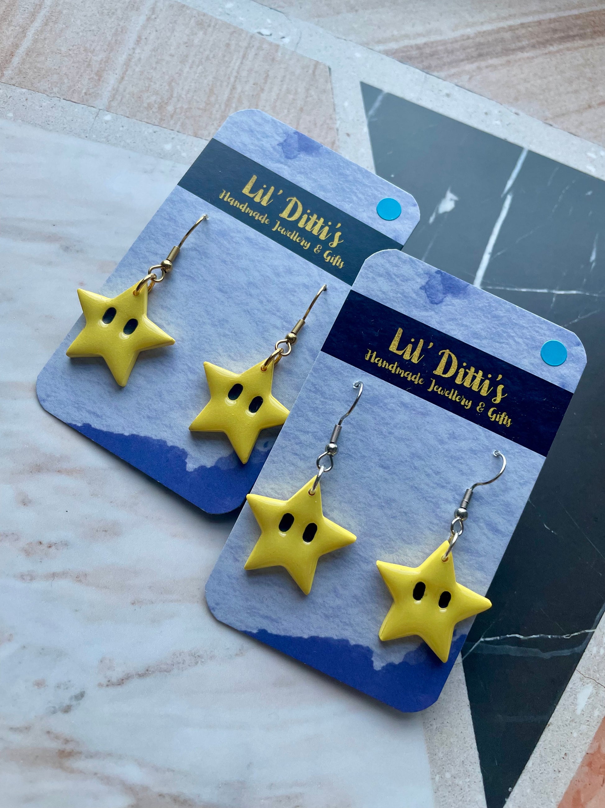 each star is handmade and painted with yellow mica, sealed in UV resin for glossy shine and longevity. all hardware is surgical steel :)